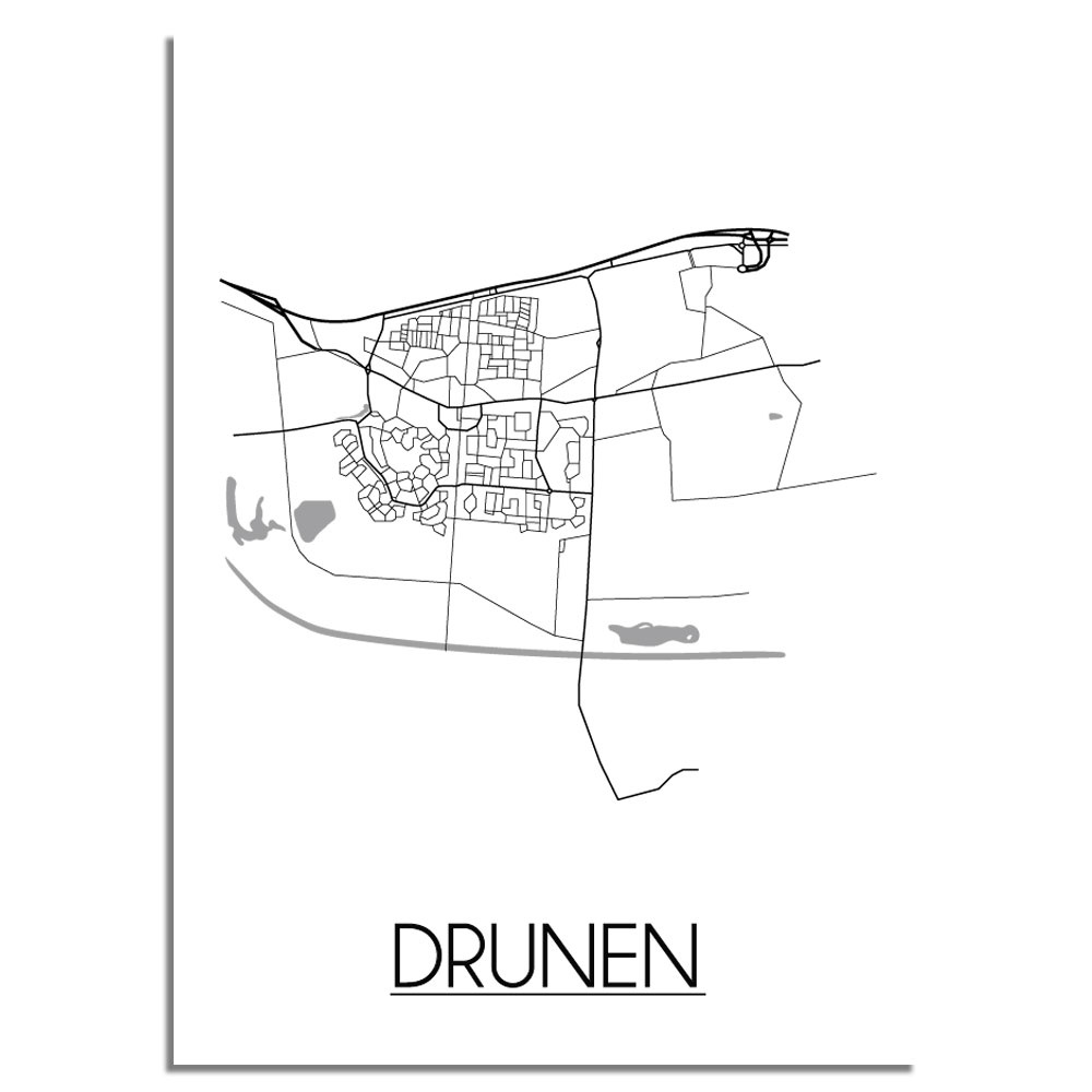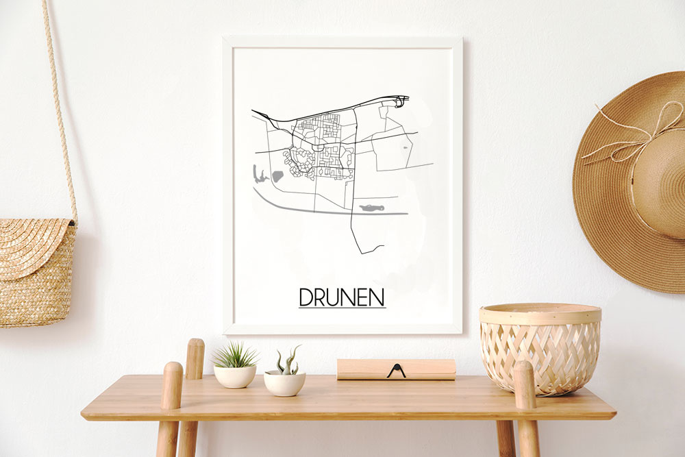 Der Innenraum kann farbig, neutral oder kontrastreich gestaltet werden. Es gibt unzählige Einrichtungsstile, aus denen wir wählen können. Welchen Stil Sie auch immer für den Urlaub wählen, ein Innenplakat einer Stadt oder eines Landes wird immer passen. Ein Plakat ist eine schöne Ergänzung des Interieurs und sorgt für eine schöne Wirkung und einen Blickfang im Raum. Dieses Stadtplan-poster von Drunen ist eine attraktive Wanddekoration zum Aufhängen in einem Rahmen neben anderen Wanddekorationen.