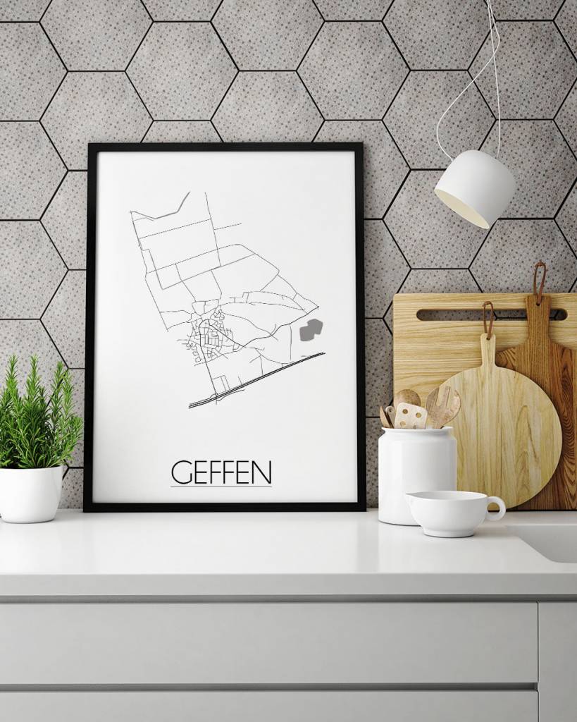 Der Innenraum kann farbig, neutral oder kontrastreich gestaltet werden. Es gibt unzählige Einrichtungsstile, aus denen wir wählen können. Welchen Stil Sie auch immer für den Urlaub wählen, ein Innenplakat einer Stadt oder eines Landes wird immer passen. Ein Plakat ist eine schöne Ergänzung des Interieurs und sorgt für eine schöne Wirkung und einen Blickfang im Raum. Dieses Stadtplanposter von Geffen ist eine attraktive Wanddekoration zum Aufhängen in einem Rahmen neben anderen Wanddekorationen.