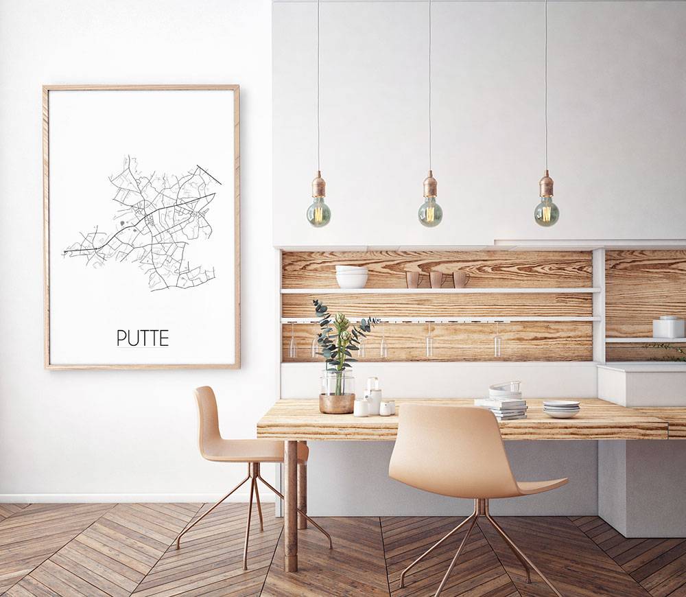Hängen Sie dieses Stadtplakat von Putte mit Washi-Tape auf, rahmen Sie das Putte-Plakat ein oder legen Sie es in ein Regal in einen Rahmen. Eine kreative und stimmungsvolle Art, das Wohnzimmer oder einen anderen Raum zu dekorieren.