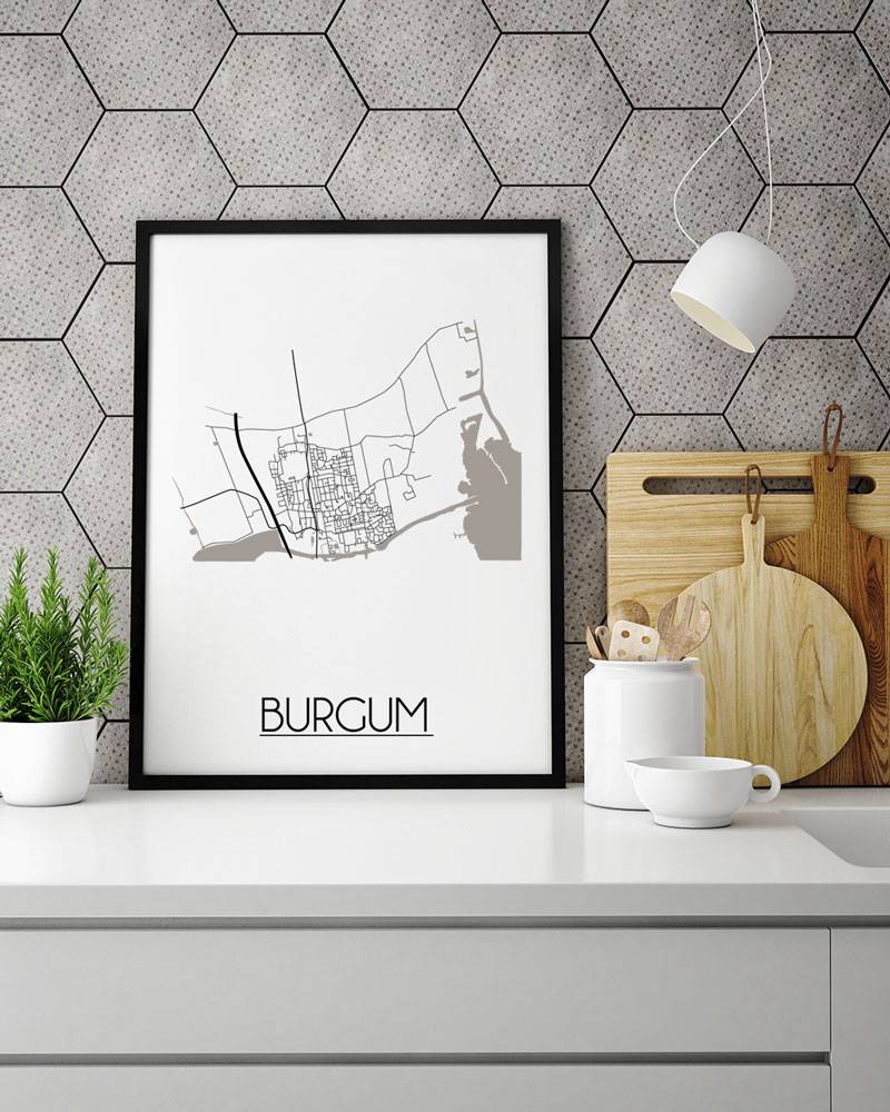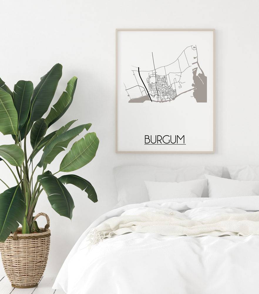 Der Innenraum kann farbig, neutral oder kontrastreich gestaltet werden. Es gibt unzählige Einrichtungsstile, aus denen wir wählen können. Welchen Stil Sie auch immer für den Urlaub wählen, ein Innenplakat einer Stadt oder eines Landes wird immer passen. Ein Plakat ist eine schöne Ergänzung des Interieurs und sorgt für eine schöne Wirkung und einen Blickfang im Raum. Dieses Stadtplanposter von Burgum ist eine attraktive Wanddekoration zum Aufhängen in einem Rahmen neben anderen Wanddekorationen.