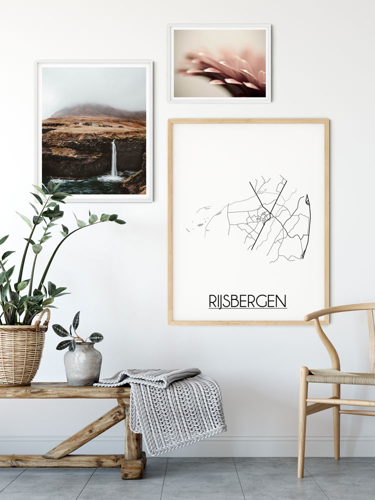Der Innenraum kann farbig, neutral oder kontrastreich gestaltet werden. Es gibt unzählige Einrichtungsstile, aus denen wir wählen können. Welchen Stil Sie auch immer für den Urlaub wählen, ein Innenplakat einer Stadt oder eines Landes wird immer passen. Ein Plakat ist eine schöne Ergänzung des Interieurs und sorgt für eine schöne Wirkung und einen Blickfang im Raum. Dieses Stadtplan-poster von Rijsbergen ist eine attraktive Wanddekoration zum Aufhängen in einem Rahmen neben anderen Wanddekorationen.