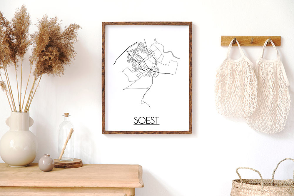 Der Innenraum kann farbig, neutral oder kontrastreich gestaltet werden. Es gibt unzählige Einrichtungsstile, aus denen wir wählen können. Welchen Stil Sie auch immer für den Urlaub wählen, ein Innenplakat einer Stadt oder eines Landes wird immer passen. Ein Plakat ist eine schöne Ergänzung des Interieurs und sorgt für eine schöne Wirkung und einen Blickfang im Raum. Dieses Stadtplan-poster von Soest ist eine attraktive Wanddekoration zum Aufhängen in einem Rahmen neben anderen Wanddekorationen.