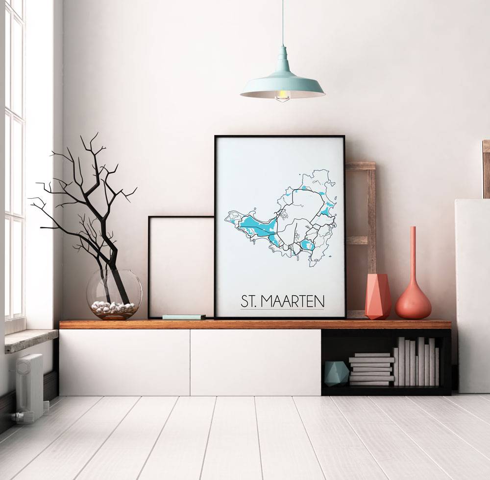 Der Innenraum kann farbig, neutral oder kontrastreich gestaltet werden. Es gibt unzählige Einrichtungsstile, aus denen wir wählen können. Welchen Stil Sie auch immer für den Urlaub wählen, ein Innenplakat einer Stadt oder eines Landes wird immer passen. Ein Plakat ist eine schöne Ergänzung des Interieurs und sorgt für eine schöne Wirkung und einen Blickfang im Raum. Dieses Kartenposter von St. Maarten ist eine attraktive Wanddekoration zum Aufhängen in einem Rahmen neben anderen Wanddekorationen.