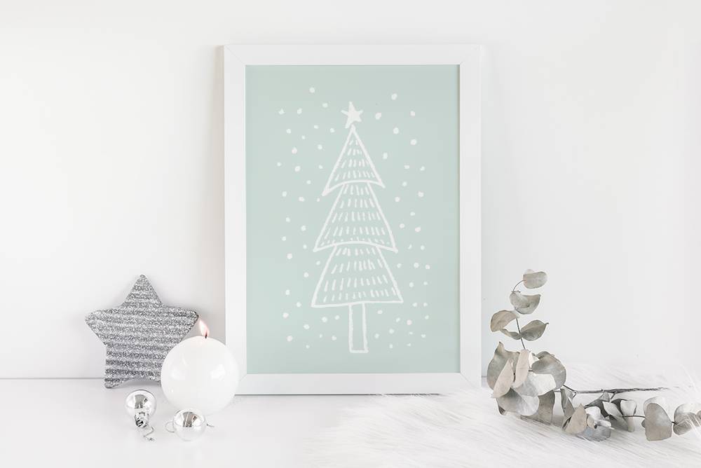 Hängen Sie dieses Weihnachtsbaumposter mit schönem festlichem Washi-Tape auf, rahmen Sie das Weihnachtsposter ein oder platzieren Sie das schwarz-weiße Poster in einem Rahmen auf einem Regal. Eine kreative und stimmungsvolle Art, das Wohnzimmer oder ein anderes Zimmer zu Weihnachten zu dekorieren.